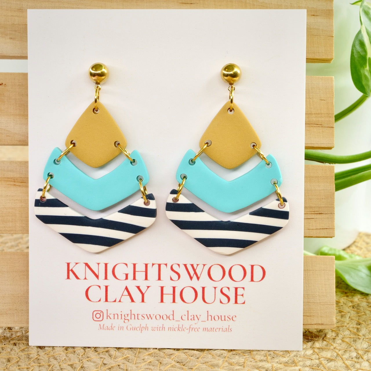 Lightweight and durable dangle earrings created by hand in small batches. Made with polymer clay, brass, and stainless steel posts.
