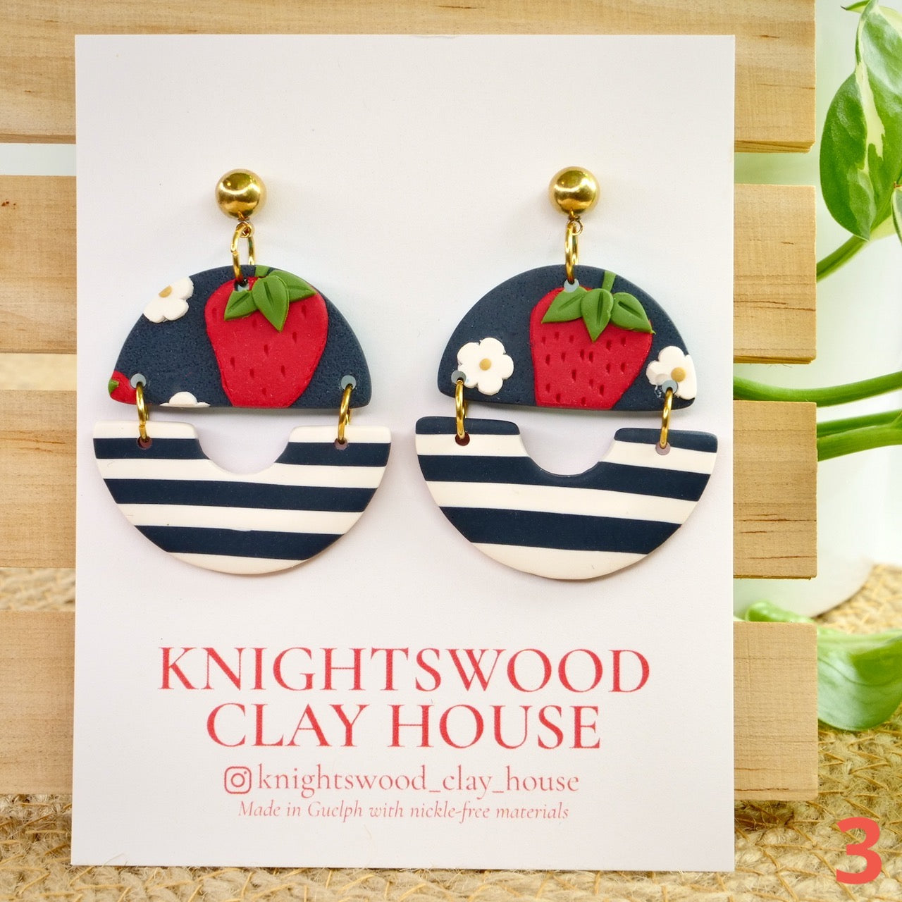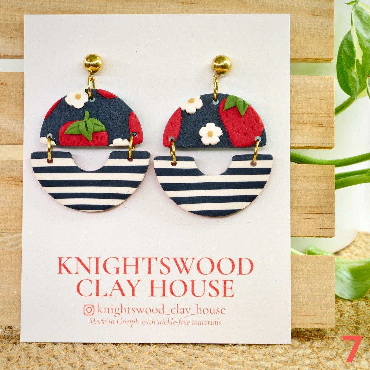 Lightweight and durable dangle earrings created by hand in small batches. Made with polymer clay, brass and stainless steel posts.