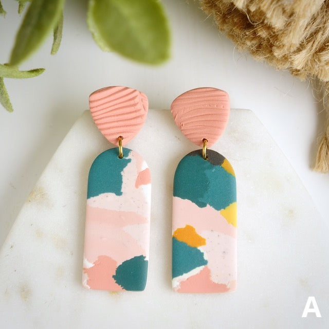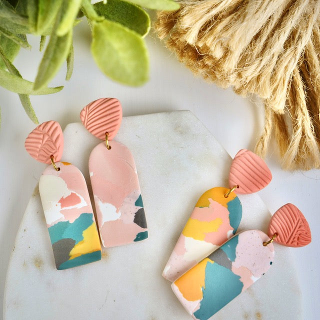 Lightweight and durable earrings created by hand in small batches. Made with polymer clay, brass, plant-based resin, and stainless steel posts.