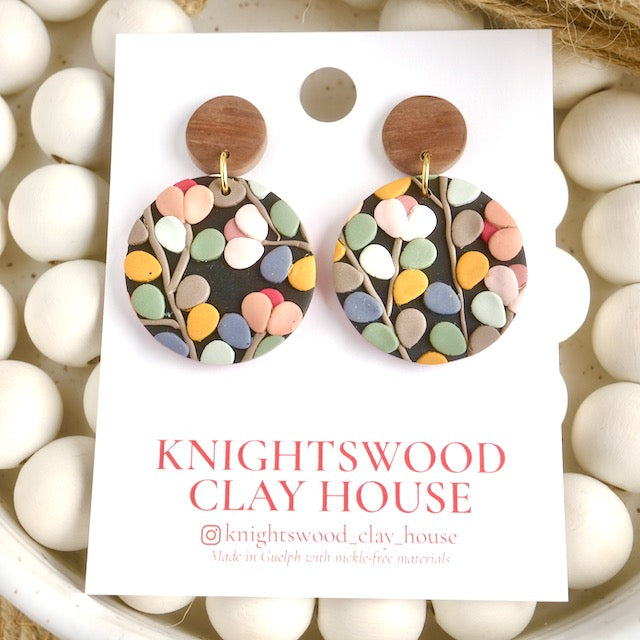 Lightweight and durable earrings created by hand in small batches. Made with polymer clay, brass, wood, and stainless steel pushback posts.