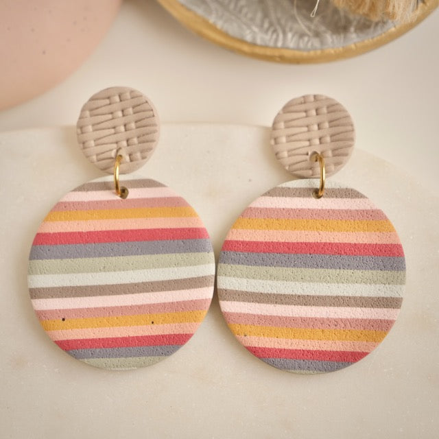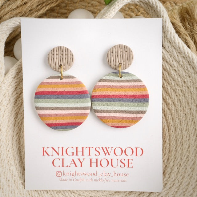 Lightweight and durable earrings created by hand in small batches. Made with polymer clay, brass, wood, and stainless steel pushback posts.