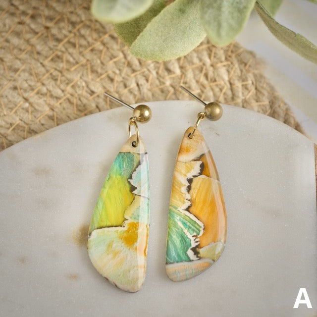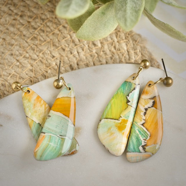 Lightweight and durable earrings created by hand in small batches. Made with polymer clay, brass, plant-based resin, and stainless steel posts.