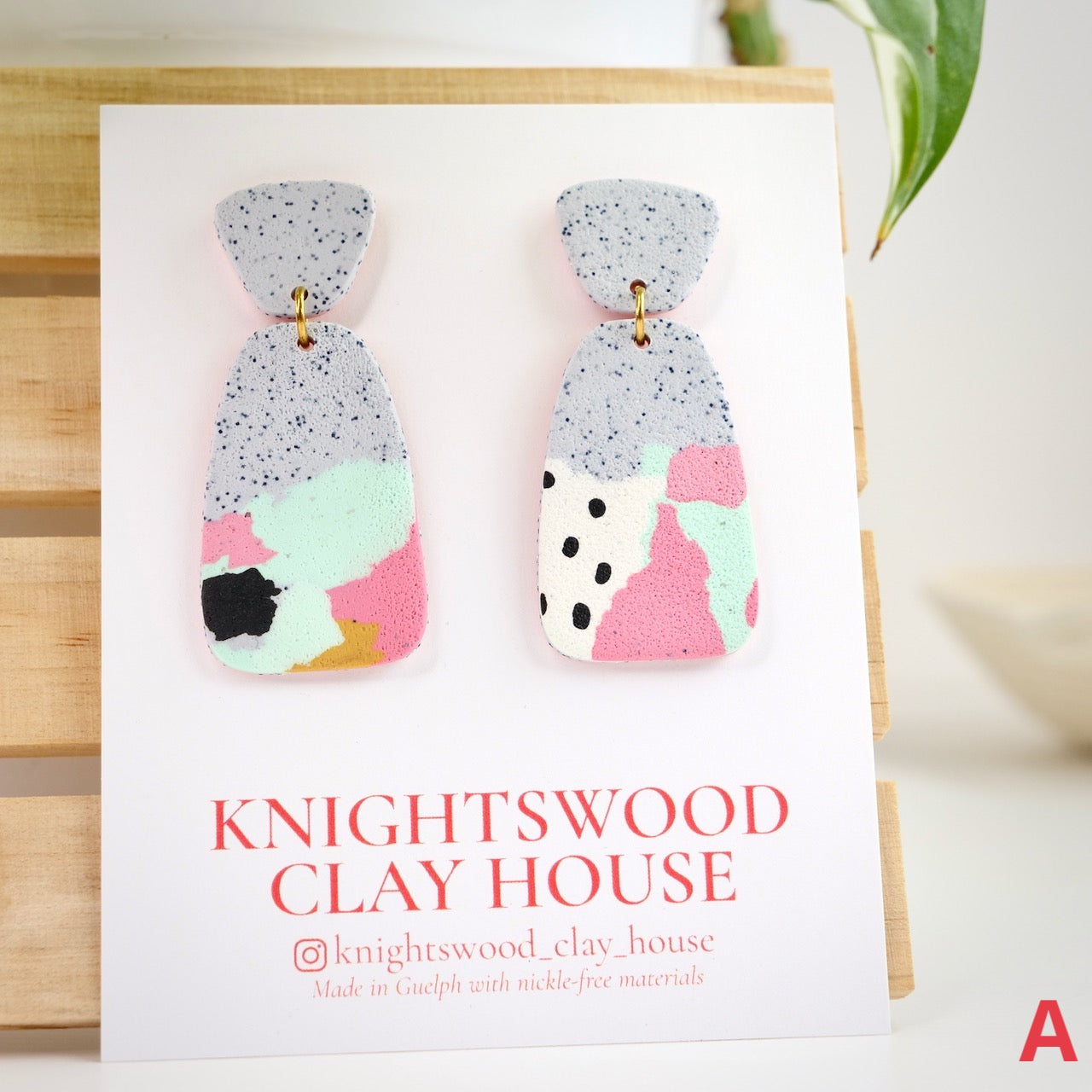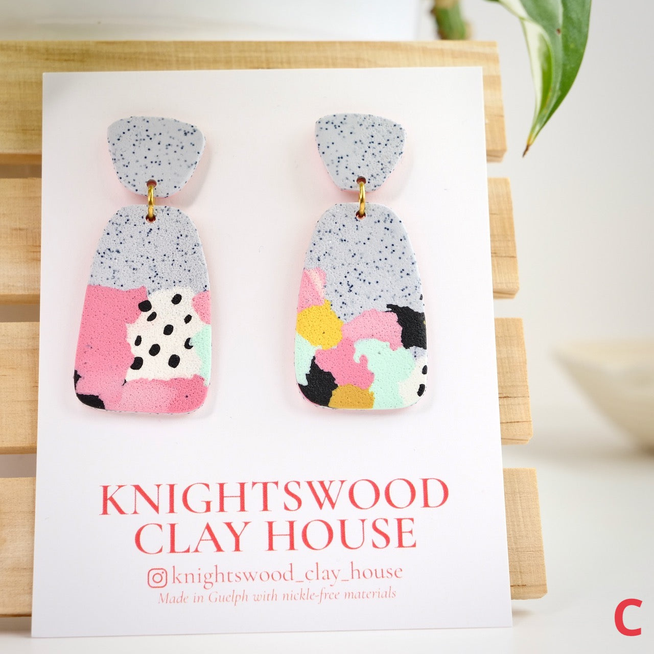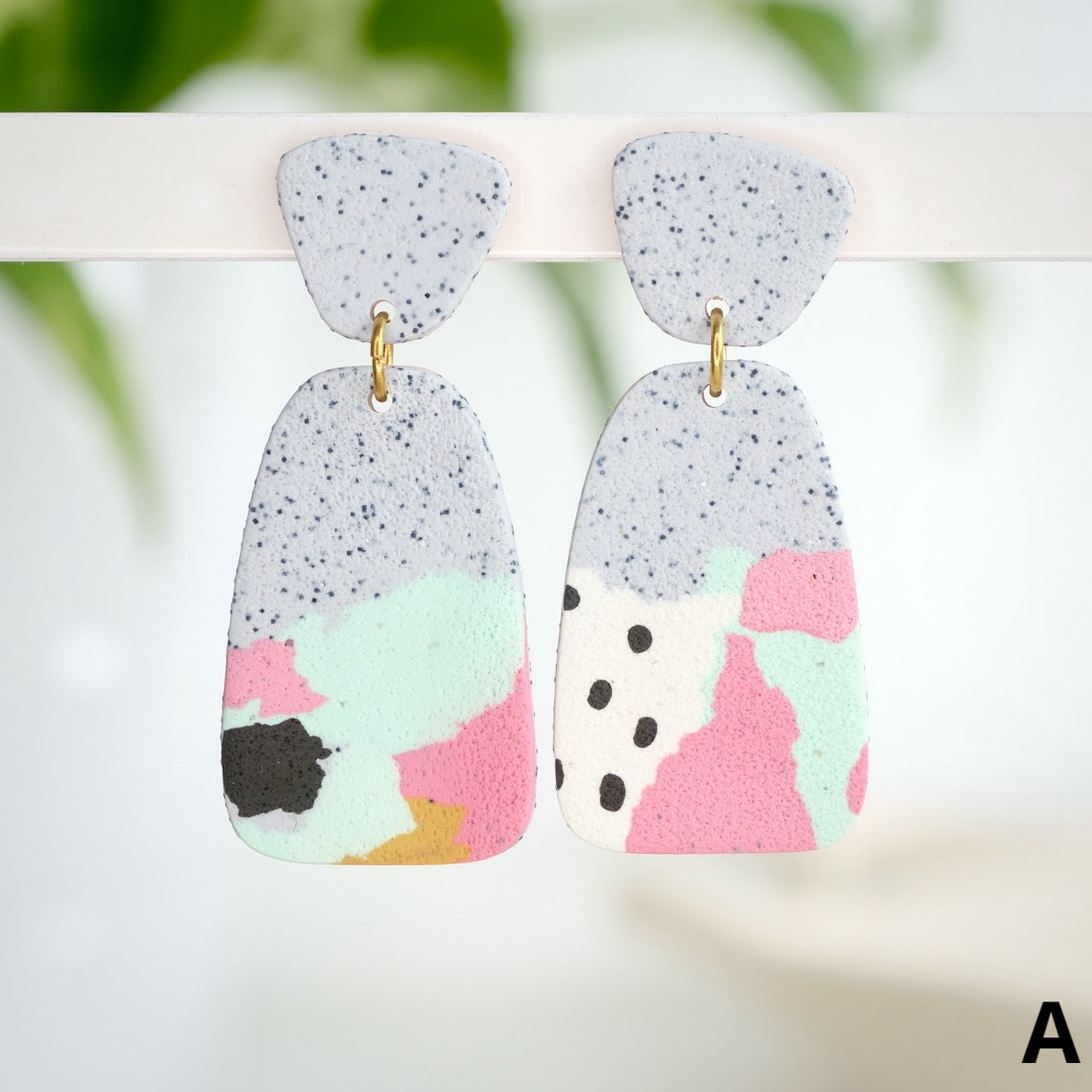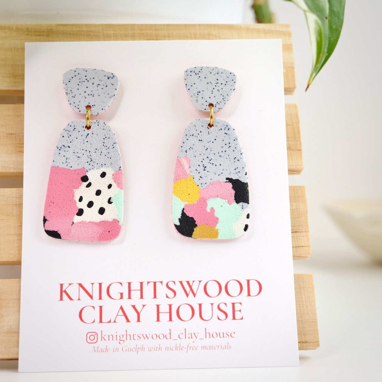 Lightweight and durable earrings created by hand in small batches. Made with polymer clay, brass, and stainless steel pushback posts.