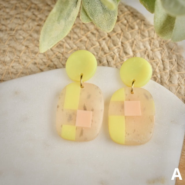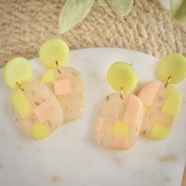 Lightweight and durable earrings created by hand in small batches. Made with polymer clay, brass, plant-based resin, and stainless steel posts.