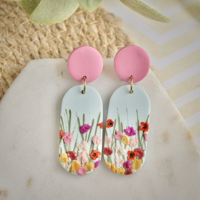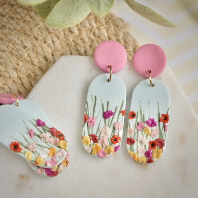 Lightweight and durable earrings created by hand in small batches. Made with polymer clay, brass, plant-based resin, and stainless steel posts.