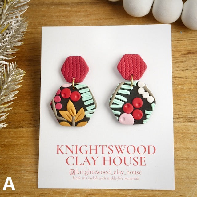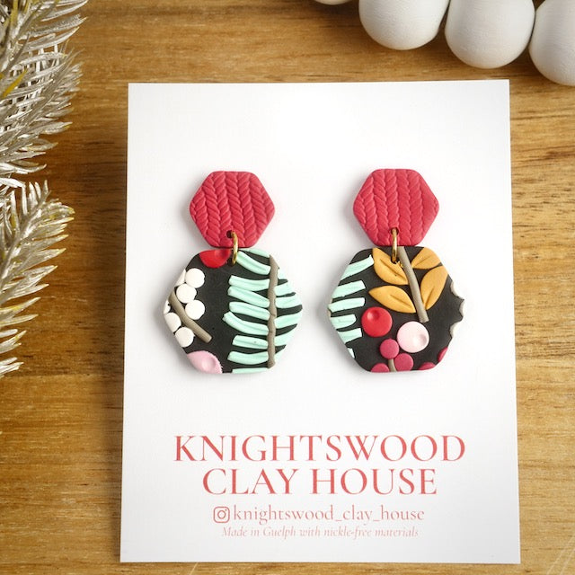 Lightweight and durable dangle earrings created by hand in small batches. Made with polymer clay, brass, and stainless steel posts.