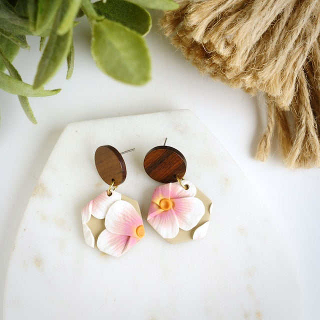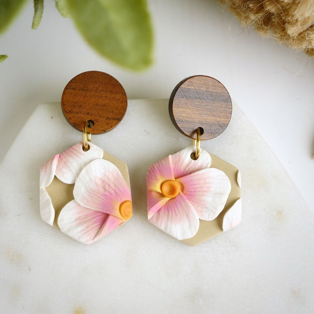 Lightweight and durable earrings created by hand in small batches. Made with polymer clay, brass, wood, plant-based resin and stainless steel posts.