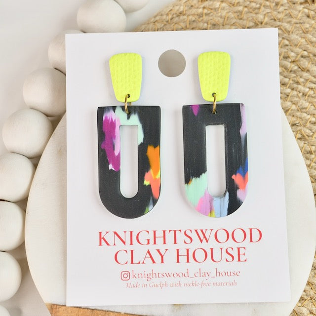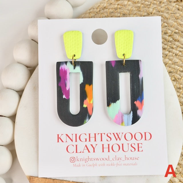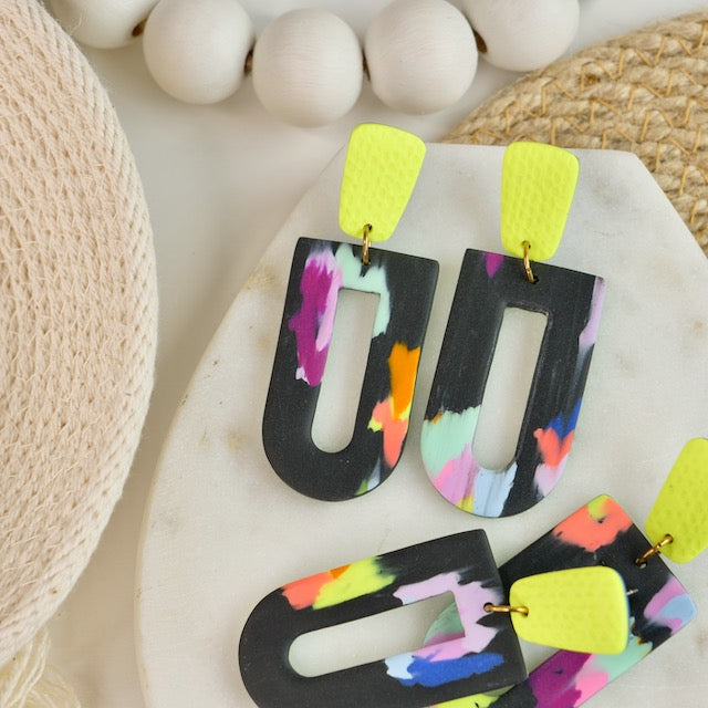 Lightweight and durable dangle earrings created by hand in small batches. Made with polymer clay, brass and stainless steel posts.