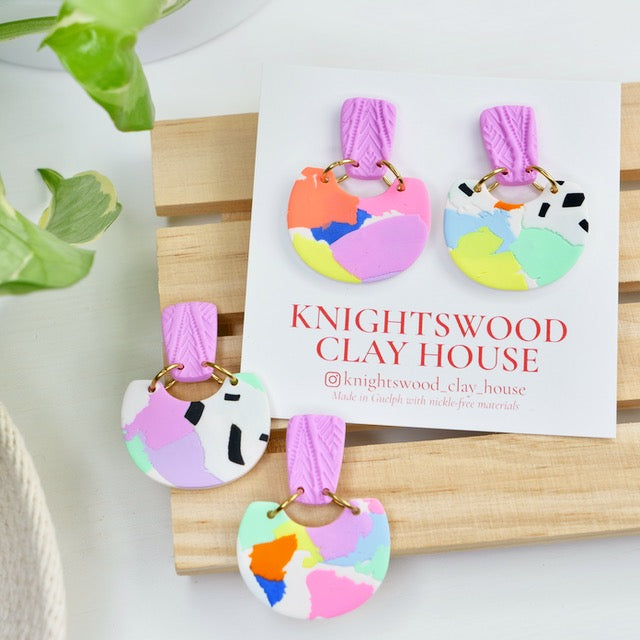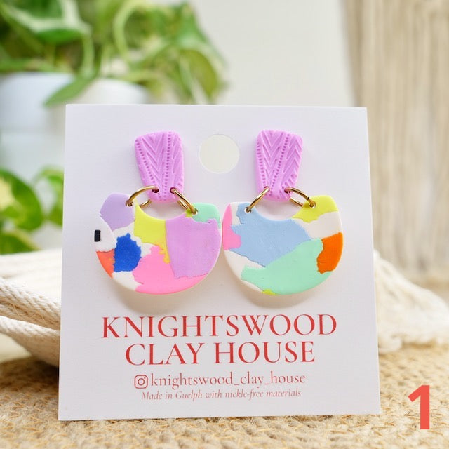 Lightweight and durable dangle earrings created by hand in small batches. Made with polymer clay, brass and stainless steel posts.