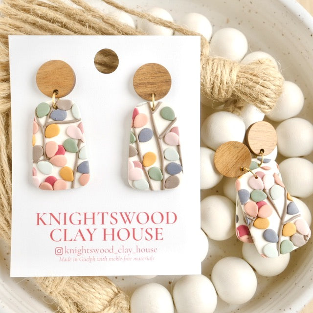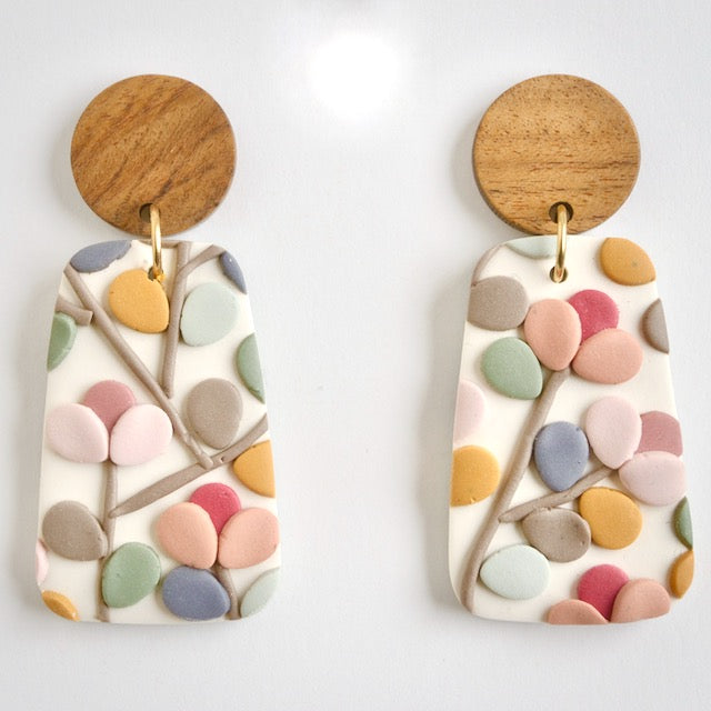 Lightweight and durable earrings created by hand in small batches. Made with polymer clay, brass, wood, and stainless steel pushback posts.