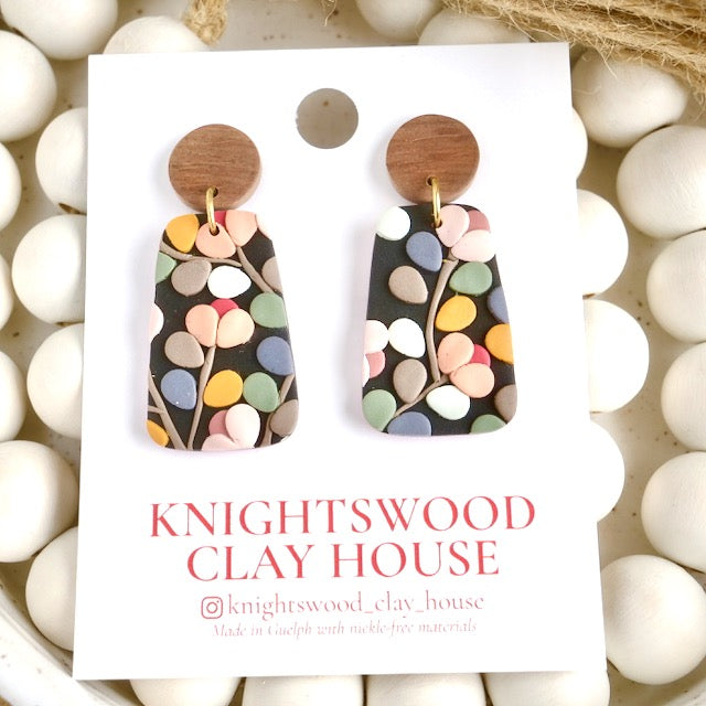Lightweight and durable earrings created by hand in small batches. Made with polymer clay, brass, wood, and stainless steel pushback posts.