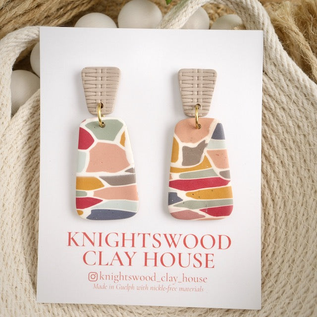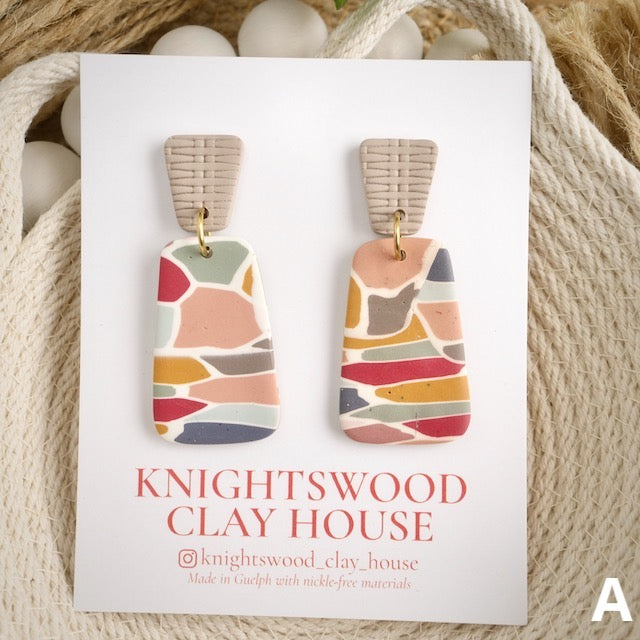 Lightweight and durable earrings created by hand in small batches. Made with polymer clay, brass, wood, and stainless steel pushback posts.
