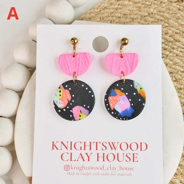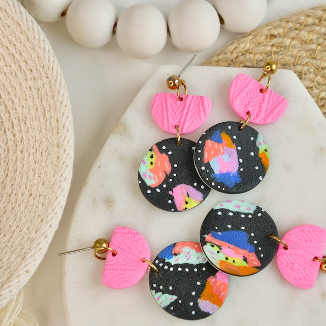 Lightweight and durable dangle earrings created by hand in small batches. Made with polymer clay, brass, and stainless steel posts.