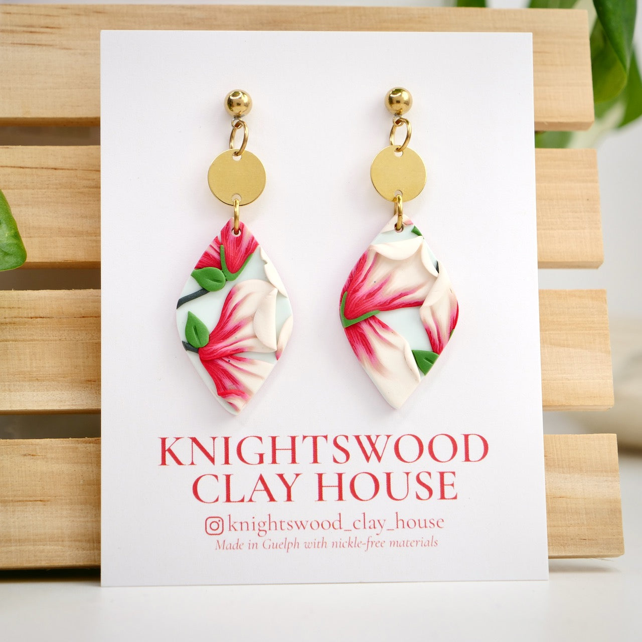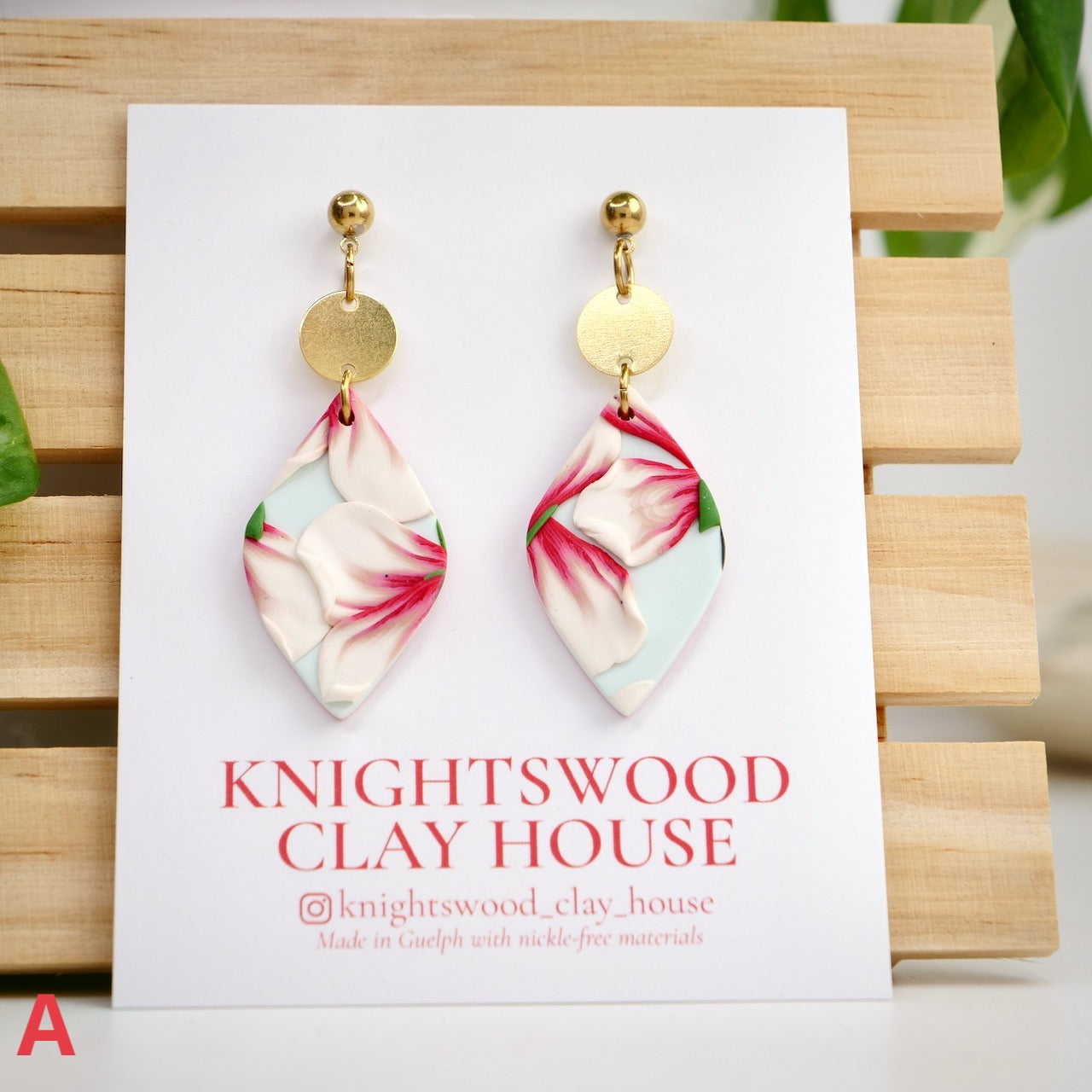 Lightweight and durable earrings created by hand in small batches. Made with polymer clay, brass, and stainless steel pushback posts.