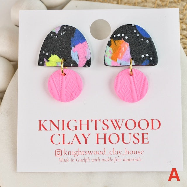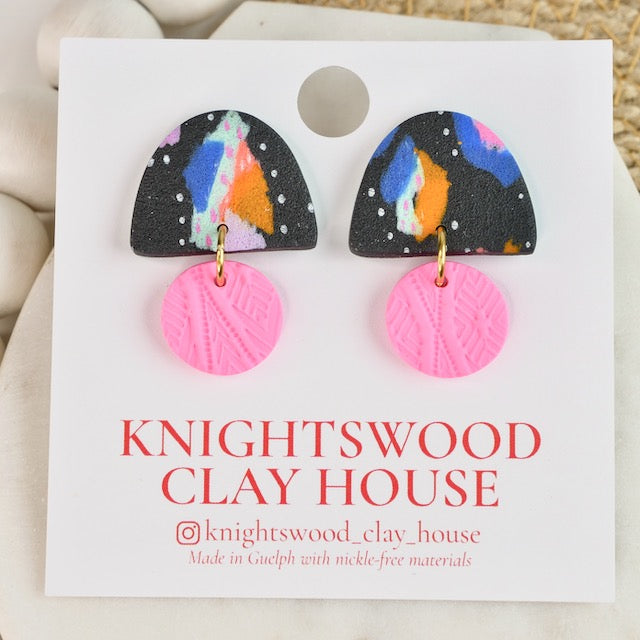 Lightweight and durable earrings created by hand in small batches. Made with polymer clay, brass and stainless steel pushback posts.