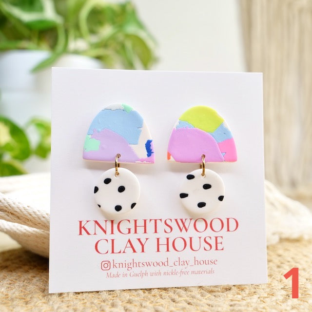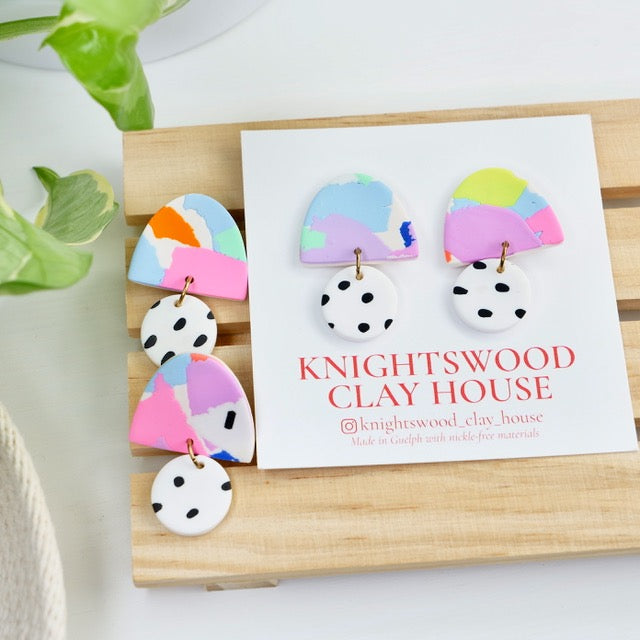 Lightweight and durable dangle earrings created by hand in small batches. Made with polymer clay, brass and stainless steel pushback posts.