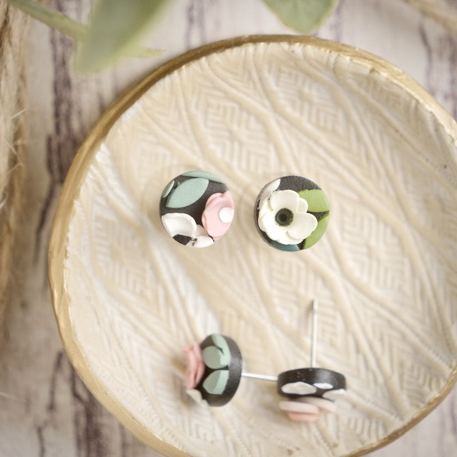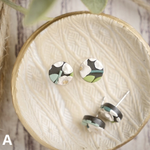 Lightweight and durable earrings created by hand in small batches. Made with polymer clay, plant-based resin, and stainless steel posts.