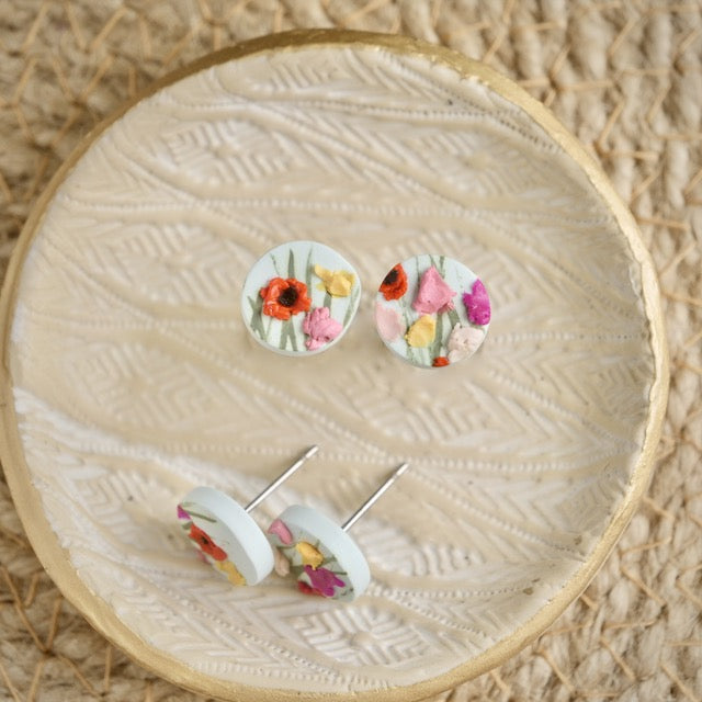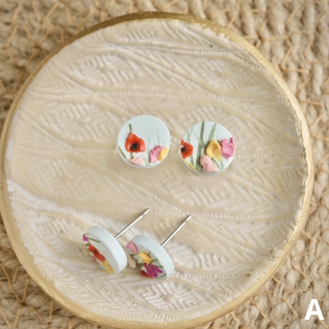 Lightweight and durable earrings created by hand in small batches. Made with polymer clay, plant-based resin, and stainless steel posts.