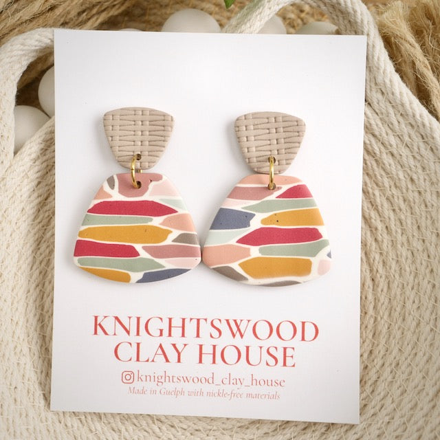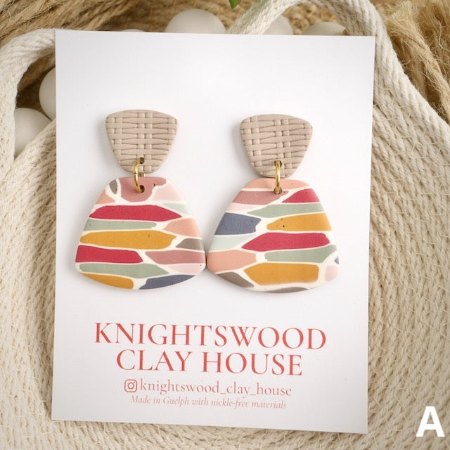 Lightweight and durable earrings created by hand in small batches. Made with polymer clay, brass, wood, and stainless steel pushback posts.