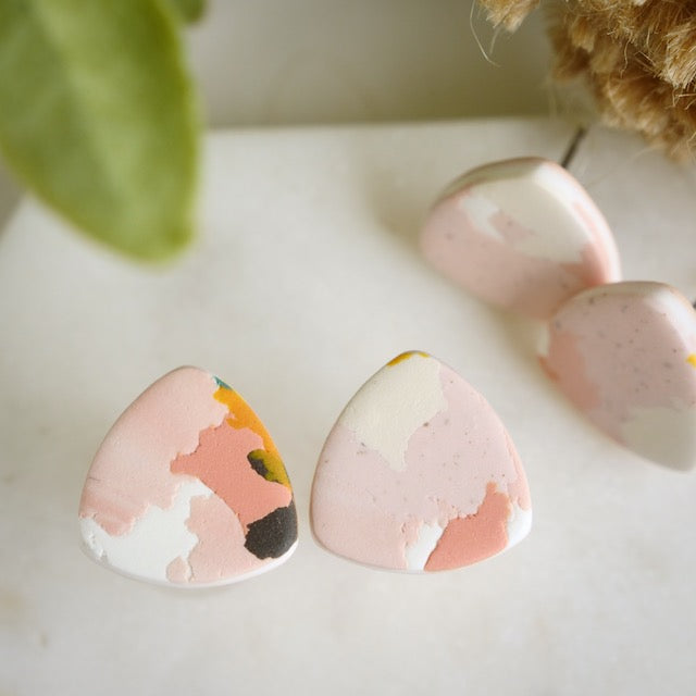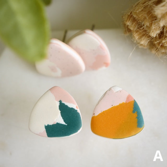 Lightweight and durable earrings created by hand in small batches. Made with polymer clay, plant-based resin and stainless steel posts.
