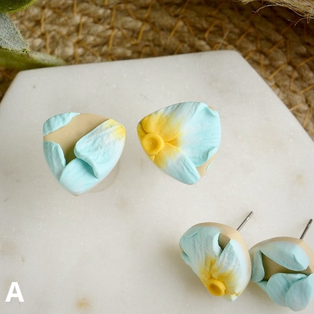 Lightweight and durable earrings created by hand in small batches. Made with polymer clay, plant-based resin, and stainless steel posts.