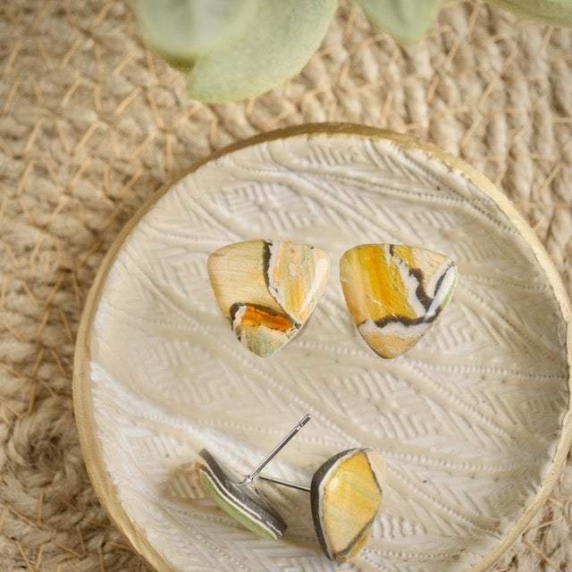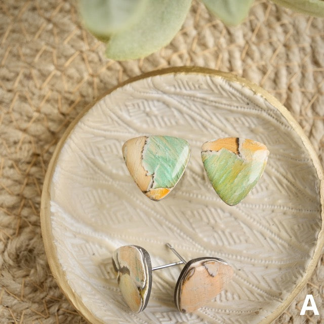 Lightweight and durable earrings created by hand in small batches. Made with polymer clay, plant-based resin, and stainless steel posts.