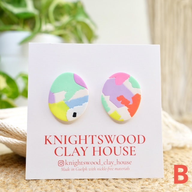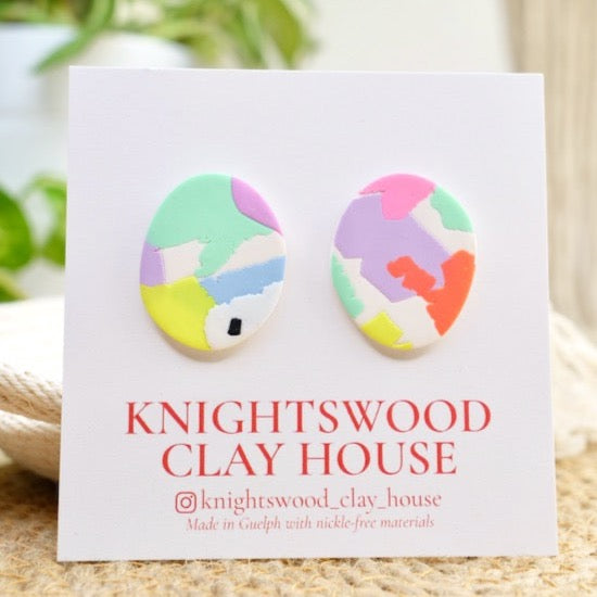 Lightweight and durable stud earrings created by hand in small batches. Made with polymer clay and stainless steel posts.