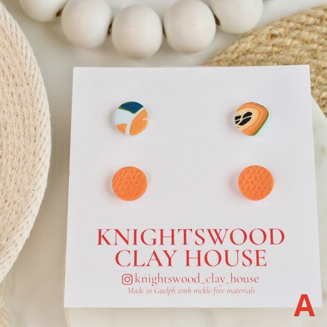 Lightweight and durable stud earrings created by hand in small batches. Made with polymer clay and stainless steel pushback posts.