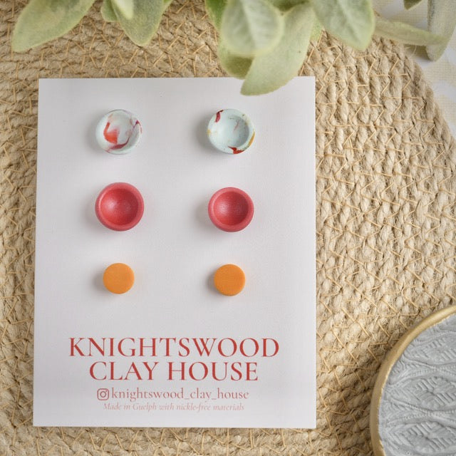 Stud 3 Pack with Blue Marble Button Studs, Cherry Red Button Studs, and Gold Micro Studs