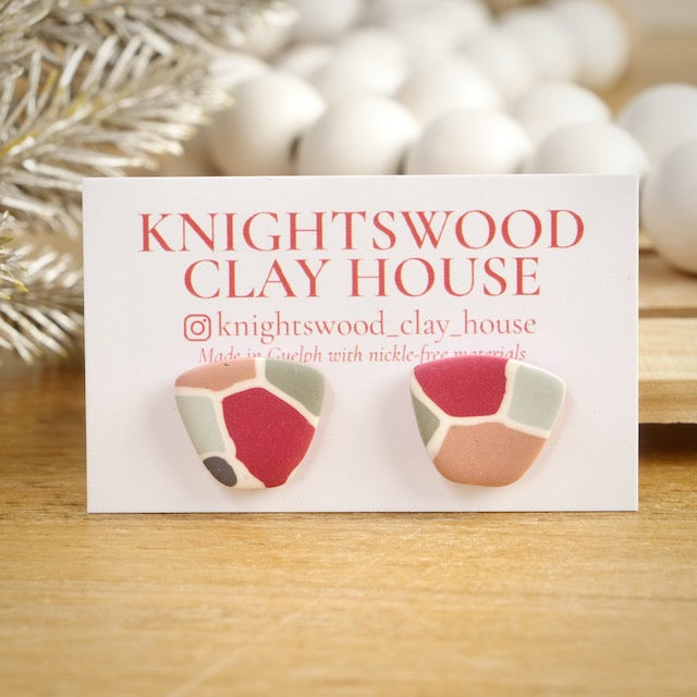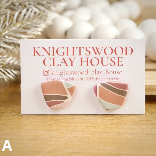 Lightweight and durable stud earrings created by hand in small batches. Made with polymer clay and stainless steel pushback posts.