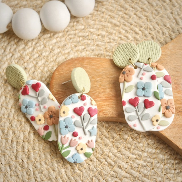 Lightweight and durable earrings created by hand in small batches. Made with polymer clay, brass, plant-based resin, and stainless steel posts.